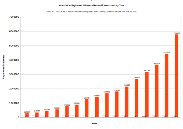 According to the American Suppressor Association (ASA), the number of silencers/suppressors registered in the United States of America was 5,776,685 as of the time the Bureau of Alcohol, Tobacco, Firearms, and Explosives (ATF) responded at the SHOT Show in January of 2026.
