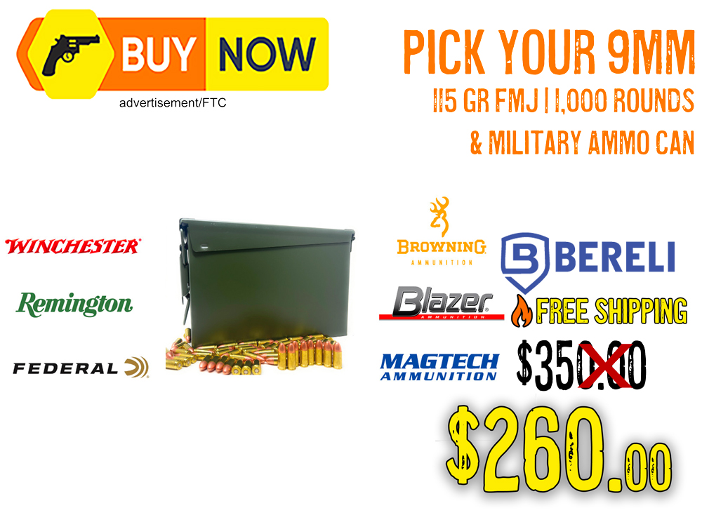 For a limited time, grab 1,000 rounds of 9mm Full Metal Jacket ammunition from your favorite brand plus a military-Ammo Can for just $260.00, or $0.26 each a round with FREE shipping — that’s a massive 44% off the regular price!