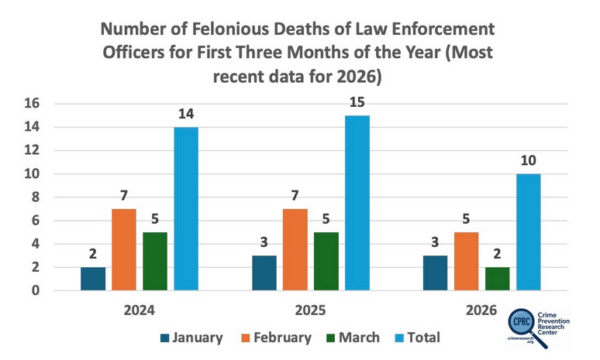 The Crime Prevention Research Center has compared the first three months of 2026 with the first three months of 2024 and 2025, using the LEOKA data.  You can see that 2026 is lower than the previous years for the first quarter.