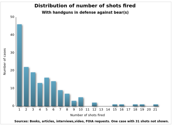 In the ongoing study of the effectiveness of handguns as a defense against bears, there are over 200 documented cases. Of those, 184 involve only handguns. The others are combination situations where other deadly force was used in addition to handguns. Of the 184 cases, 161 include information about the number of shots fired. In 23 cases, the number of shots is not known.